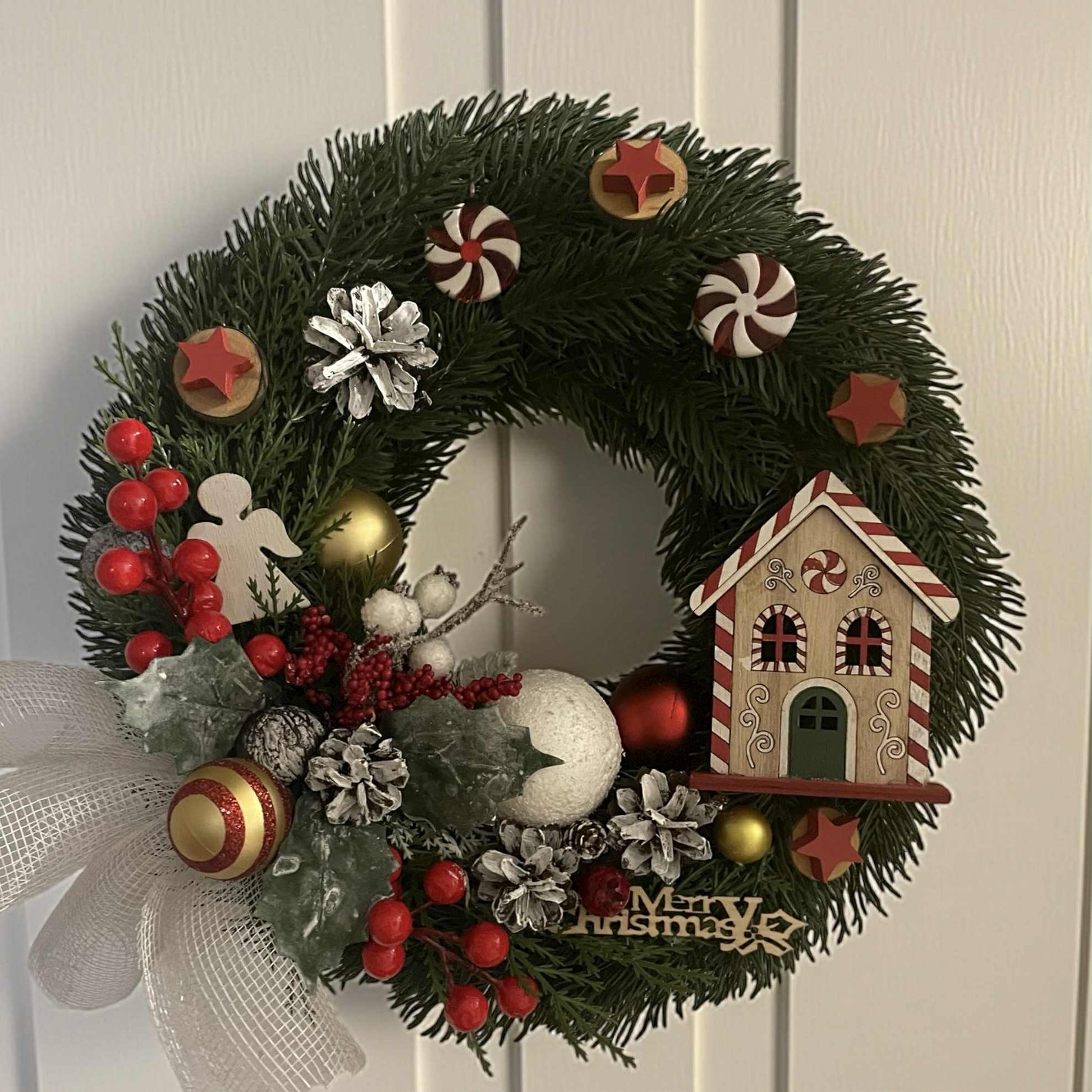 Coroniță de Crăciun de 40 cm, în culorile roșu și auriu, cu acadea rotativă.