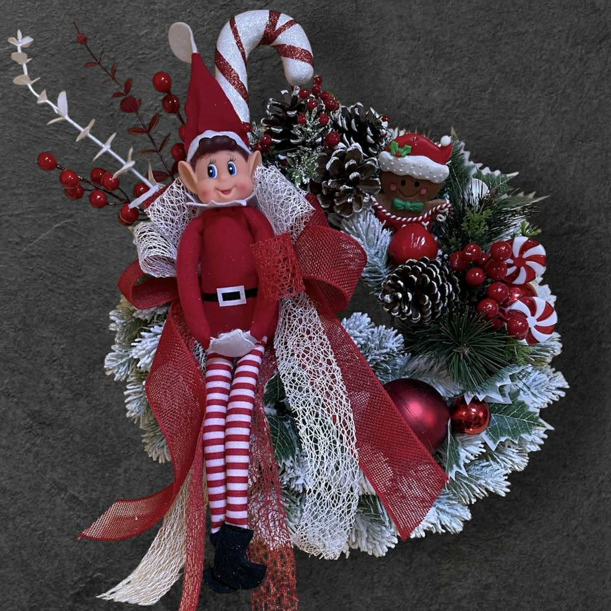 Coroniță de Crăciun cu elf, în culorile roșu și alb, 35x40 cm.