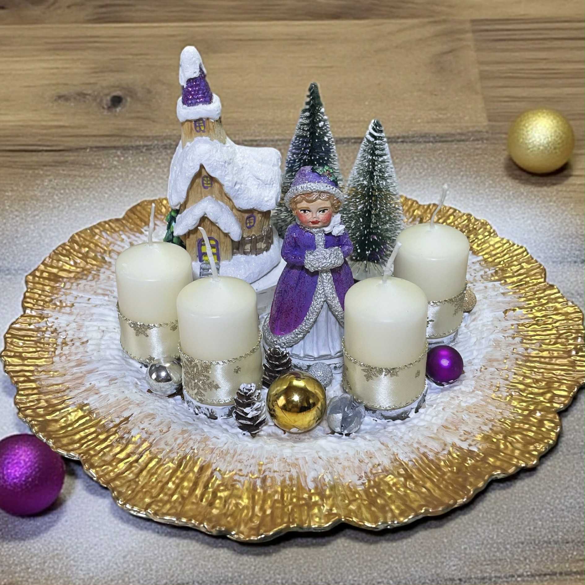 Decorațiune de Advent de 30 cm, în culori argintiu, auriu și mov, cu globulețe mici de Crăciun și elemente naturale.
