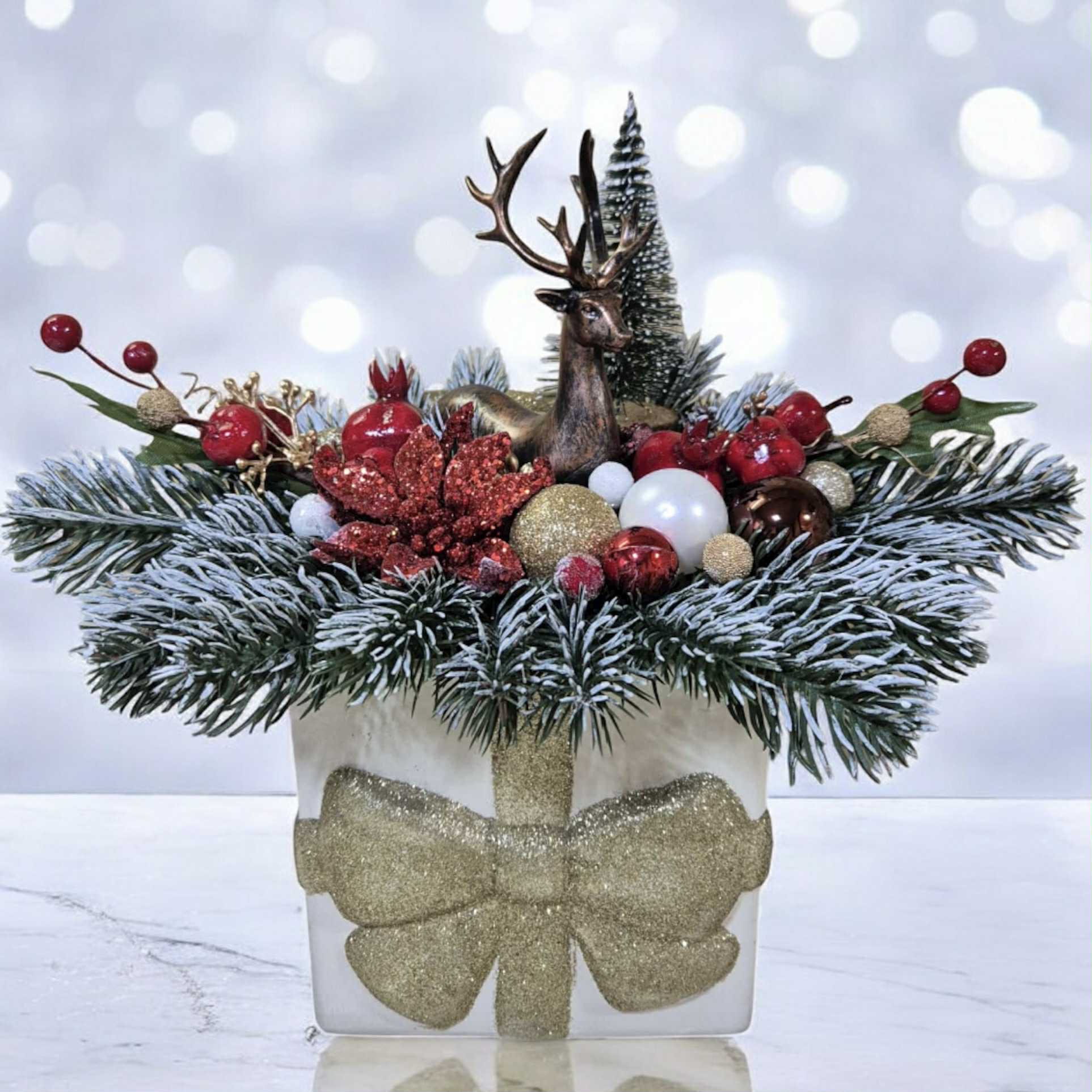 Decorațiune de Crăciun 30x30 cm cu ren bronz, în culorile roșu, auriu și alb.
