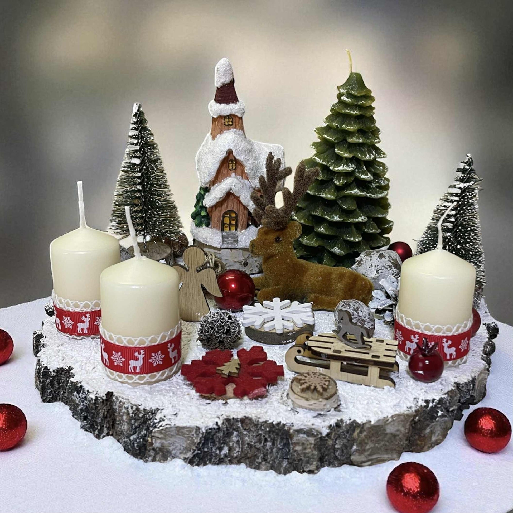 Decorațiune de Crăciun de 35 cm, pe felie de lemn, cu un mic ren, elemente din lemn și materiale naturale.