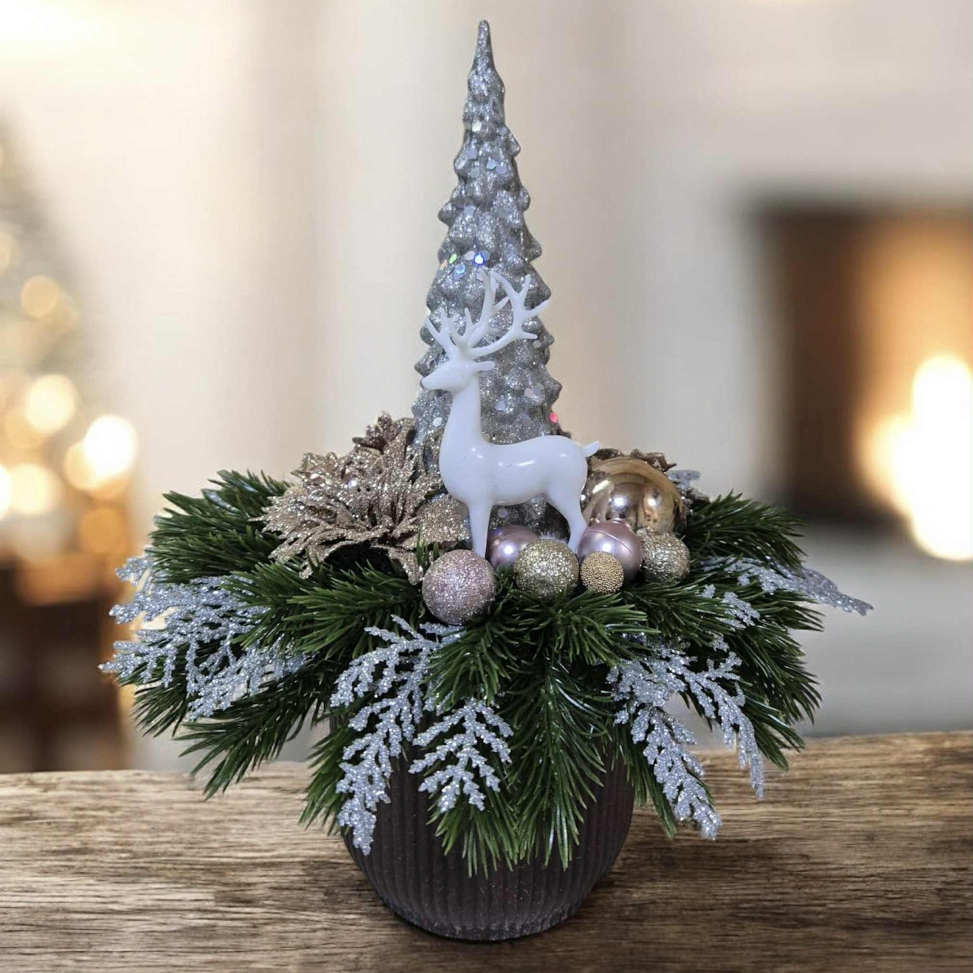 Decorațiune de Crăciun 29x30 cm cu ren alb, în culorile șampanie și rose gold.