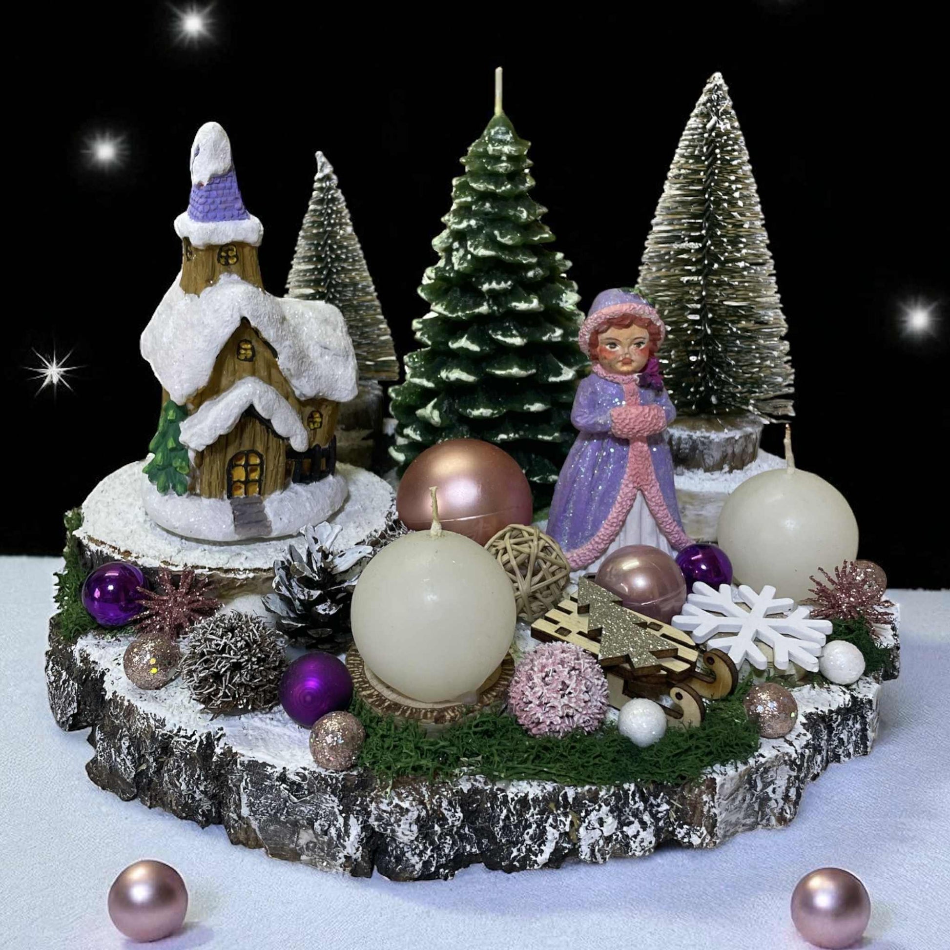 Decorațiune de Crăciun de 30 cm, pe felie de lemn, în culori rose gold și mov, cu elemente din lemn și materiale naturale.