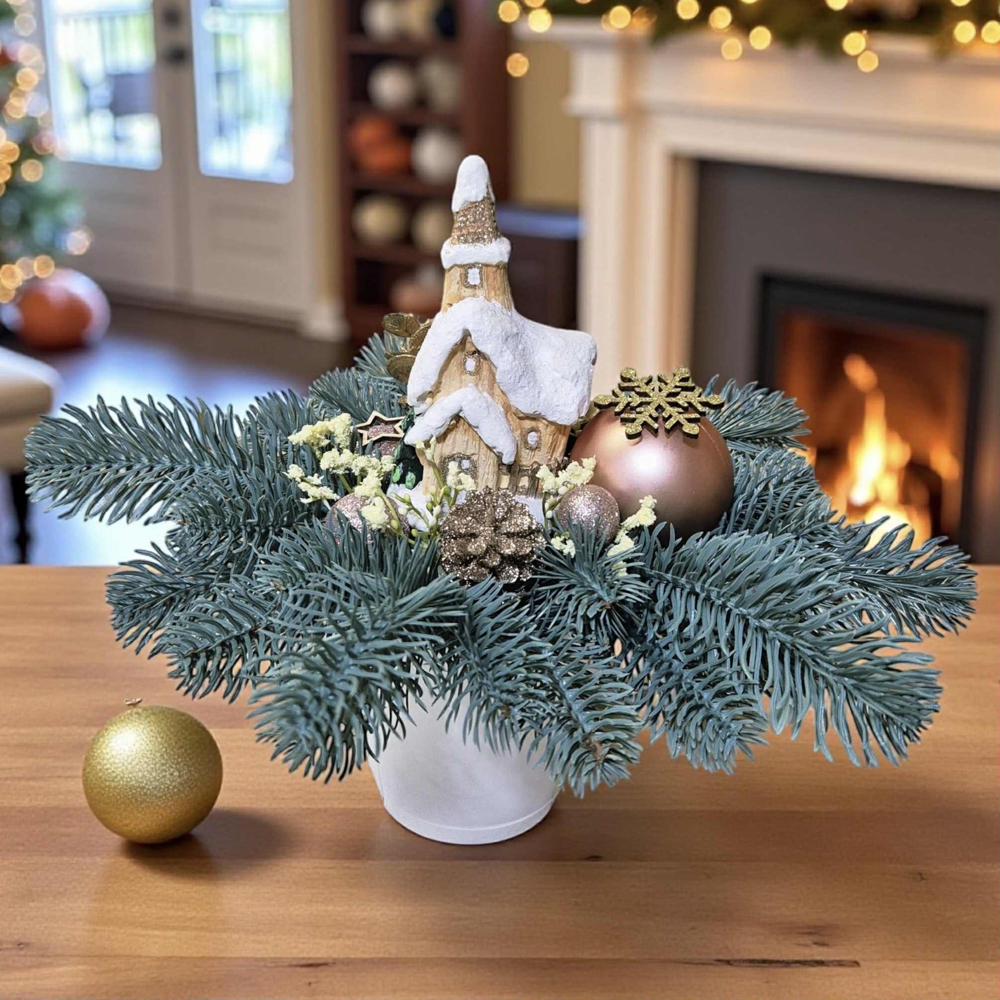 Decorațiune de masă de Crăciun cu mică biserică, dimensiune 33x26 cm.